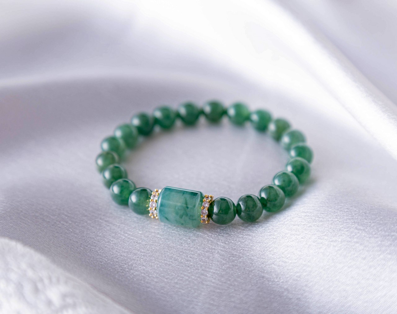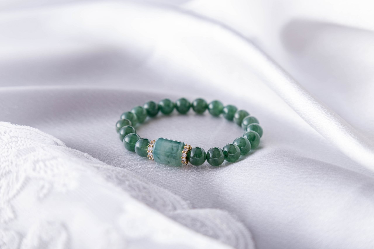 翡翠飄花手串以優質翡翠為主要材質的精美飾品,每顆珠子上都有獨特的飄花紋理,這些自然的花朵狀紋理隨意分佈,展現了翡翠的獨特魅力。